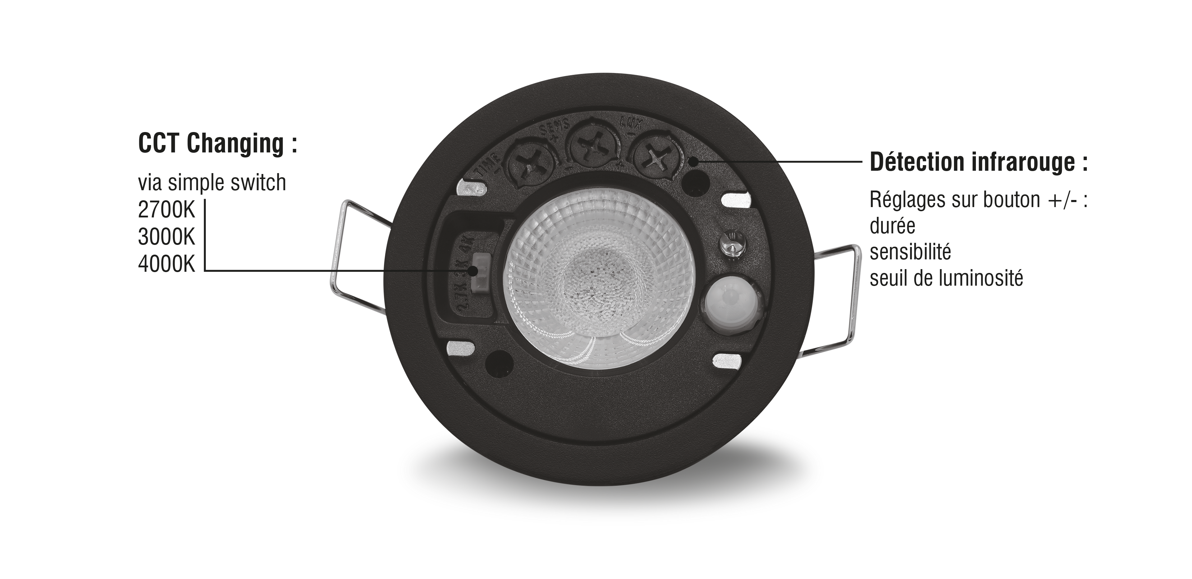 Le spot HORACE, nouveauté 2024, évolue pour l'année 2025. Il vient se parer de collerettes magnétiques disponibles dans différents coloris interchangeables même après l'installation du luminaire. Toujours équipé d'un détecteur infrarouge avec seuil de luminosité, pratique pour l'éclairage de balisage. Il conserve son CCT changing, son efficacité lumineuse et sa durabilité élevées, compatible BBC et RE2020, étanche IP65, et recouvrable d'isolant... le tout avec avec un diamètre d'encastrement réduit (Ø68 mm). Un spot hautement compétitif. Collerette magnétique rondes ou carrées à commander séparément